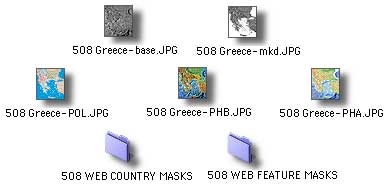 78 Relief Maps (72 dpi) in three variations of colorization and a variety of bitmap masks. Each map and all masks relating to that map are prefixed by a number, and by the suffix ".JPG" as in "508 Greece-base.JPG" for both Macintosh or Windows. These are identified as follows:
