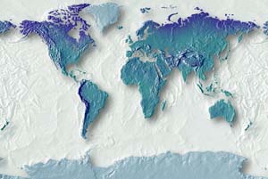 Pastel shades of blue:purple land - light blue ocean