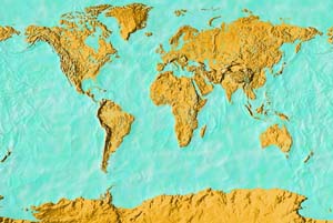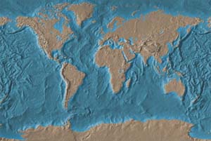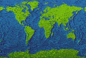 Pale green & brown land - mottled blue ocean