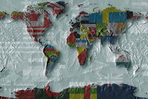 Land and ocean with superimposed flags